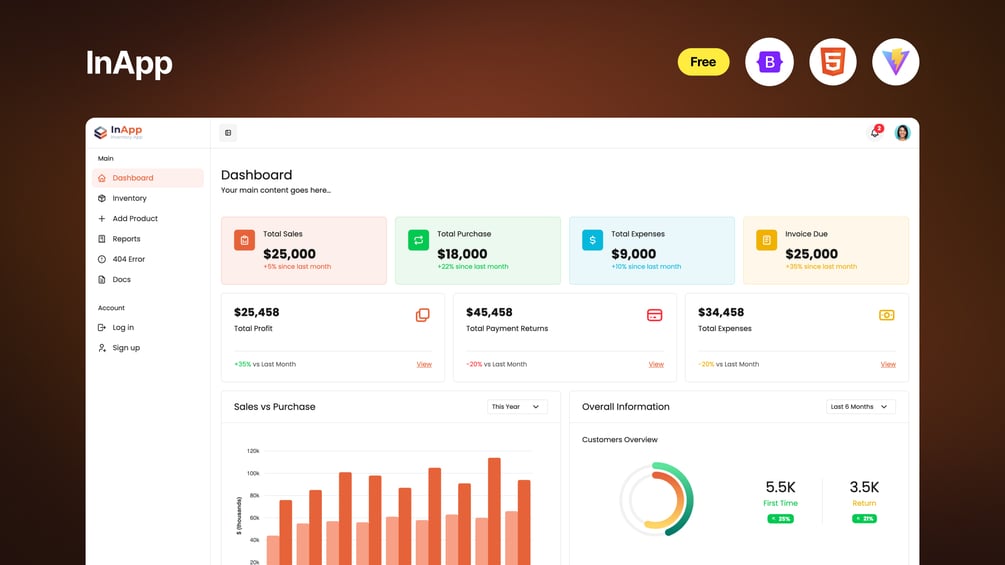 A clean, modern, and responsive Inventory Management Admin Dashboard built using Bootstrap 5 and Vite.js.