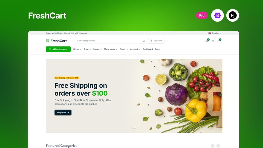 FreshCart is a modern Next.js eCommerce template built for grocery stores, online marketplaces, and multi-category shops. Powered by Next.js, it delivers lightning-fast performance, SEO-friendly server-side rendering, and smooth code splitting—ensuring a seamless shopping experience for your customers.