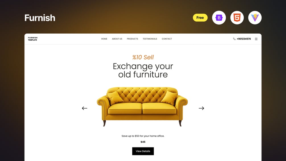 A clean and elegant Bootstrap 5 template built for furniture stores, interior brands, and home décor businesses. Fully responsive and ready to customize with product listings, homepage slider, testimonials, newsletter form, and more.