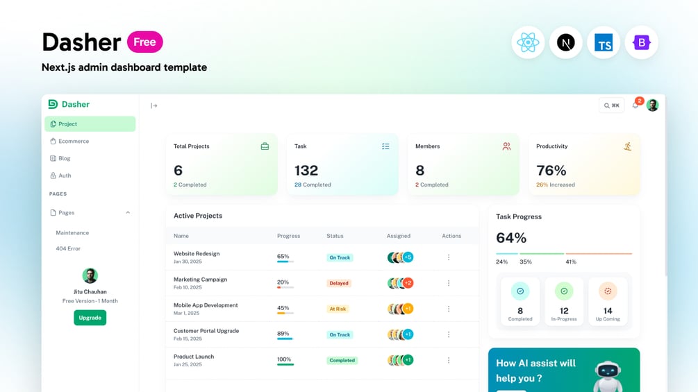 Dasher is a clean, minimal, and free Next.js admin dashboard template built using Bootstrap 5. Itβs perfect for developers, startups, and creators building modern web apps, internal dashboards, or SaaS platforms.