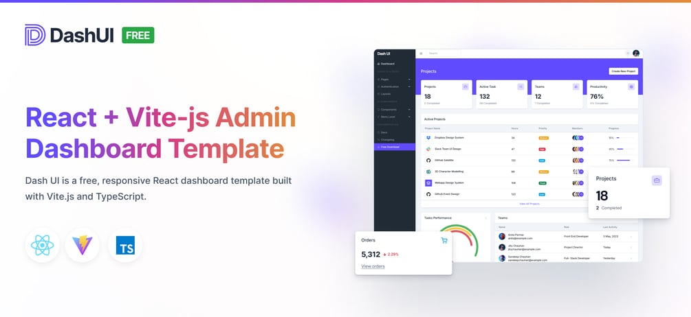 Dash UI is a free, responsive React dashboard template built with Vite.js and TypeScript. Ideal for building modern admin panels and web applications, it offers a fast, customizable framework with essential UI components to kickstart your project.
